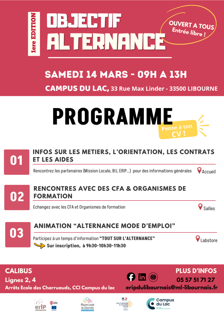 L’Espace Régional d’Information de Proximité – ERIP et le Centre d’Information et d’Orientation du Libournais organisent leur premier salon de l’alternance à Libourne.